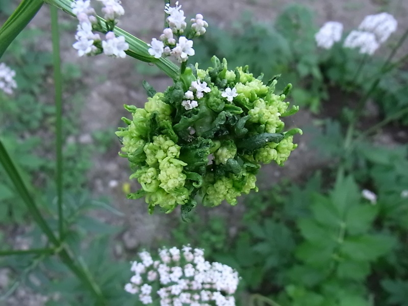 | Дмитрий Орешкин | В соцветии разрослись прицветные листья. А из-за чего уровень ростовых гормонов (или их аналогов) в соцветии повысился - непонятно. |