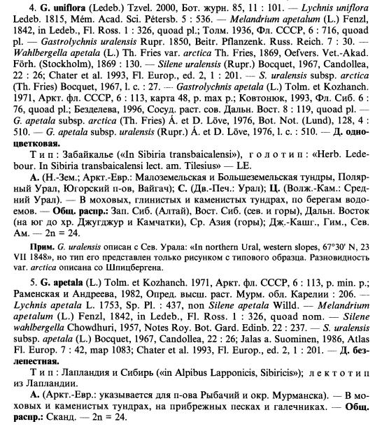 Тогда надо ещё Gastrolychnis apetala subsp. uralensis, G. uralensis и Silene uralensis из синонимов S. apetala перенести в синонимы G. uniflora, а также разобраться со статусом G. apetala subsp. arctica в связи с появлением новой комбинации.