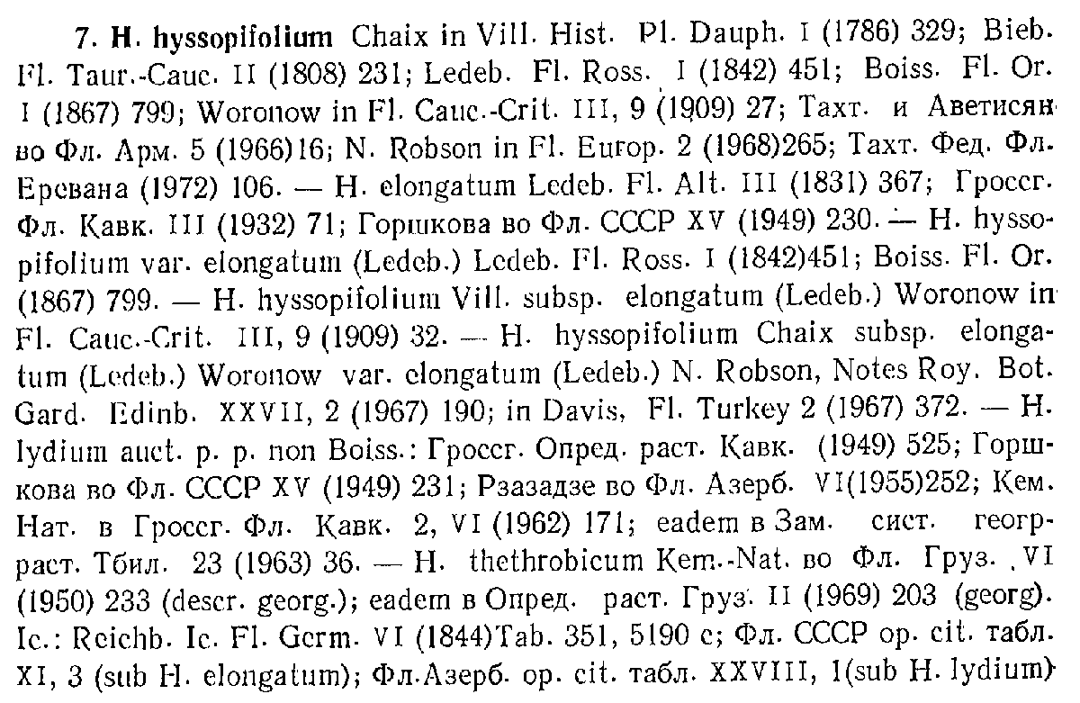 | Андрей Ковальчук | Этот вид описан в 1-м издании Флоры Грузии (1950), т. 6, с. 233, но описание опубликовано на грузинском языке. Во 2-м издании Флоры Грузии (1983) (т. 8, с. 322) сведён в синонимы к H. hyssopifolium Chaix. Последняя книга есть в библиотеке Шипунова, но она на грузинском. |