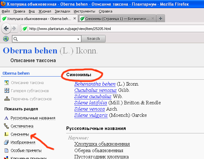 Например, на страничке с описанием Хлопушки обыкновенной видны все синонимы, имеющиеся у Черепанова.