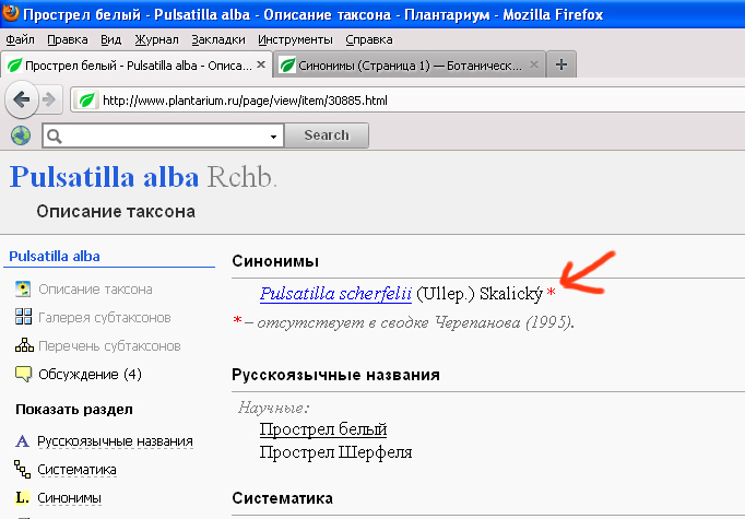 А вот на странице Прострела белого отмечен отсутствующий у Черепанова синоним.