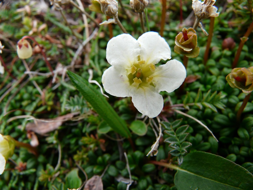 | Наталия Савкина | Здесь несколько растений на фото, не разобралась, этот цветок-Диапенсия обратнояйцевидная? Рядом ее веточки расположены. Снято на подходе к Мутновскому вулкану, 18.08.2011. |