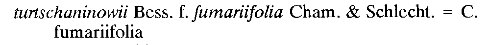 А поскольку турчанинови уже сделали САМОСТОЯТЕЛЬНЫМ, причём ОТЛИЧНЫМ (ДРУГИМ) от Corydalis turtschaninowii Bess. f. fumariifolia Cham. & Schlecht. (эта запись должна быть курсивом и быть отнесенной к синонимам фумариифолии, а этого нет), то не только эта запись (Corydalis turtschaninowii Bess.) должна быть НЕ курсивом, но и НЕ перечеркнутой. А то получилось, что изменив принципиальную ситуацию с видом, оставили то, что изменилось в первую очередь.  | | Николай Степанов | Corydalis turtschaninowii Bess. f. fumariifolia Cham. & Schlecht.