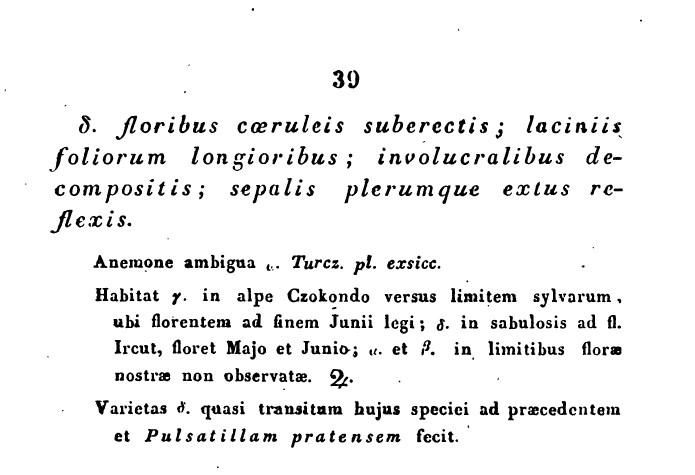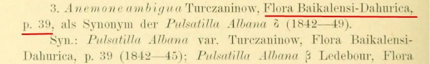 Тем не менее, по всей вероятности, до Хайека комбинация Anemone ambigua Turcz. не была действительно обнародована, т.к. использовалась только на рукописных гербарных этикетках Турчанинова или же приводилась в качестве синонима. Так что, насколько я могу судить, именно работу Хайека следует считать местом действительного обнародования комбинации Anemone ambigua Turcz. (ср. со списком синонимов P. ambigua в 12-м томе "Растений Центральной Азии" (с. 68-69  . Но, по большому счёту, в данном случае не столь важно, что и как опубликовал Хайек. Основной вопрос - было ли название Anemone ambigua (или Pulsatilla ambigua) действительно обнародовано до 1889 г.? Насколько я могу судить, не было. Наличие изданных эксикат особо ничего не меняет, т.к. их этикетки были рукописными и не содержали валидирующего описания. Публикация новых названий на этикетках эксикат допускалась, но для этого они должны были быть воспроизведены машинным способом, как, например, здесь: