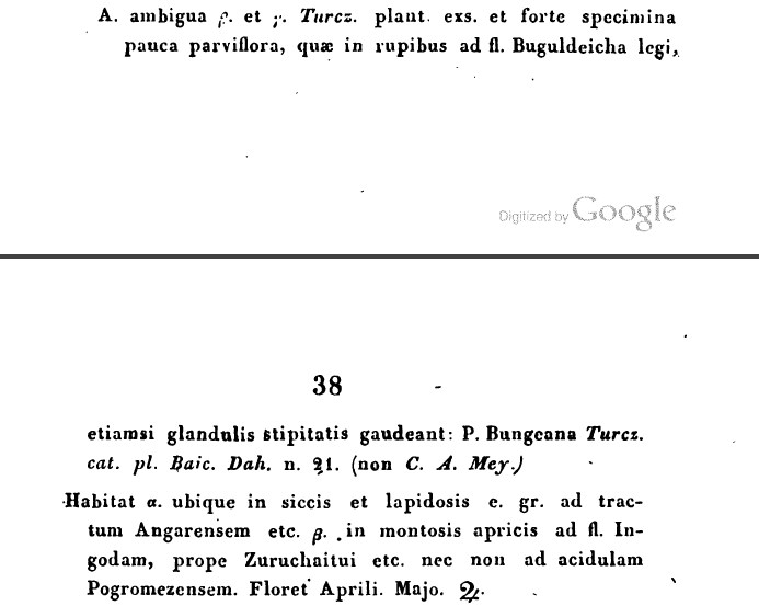 Павлов и Крылов вполне справедливо считали комбинацию A. ambigua Turcz. недействительно обнародованной, а потому независимо опубликовали свои комбинации, использовав базионим Максимовича. Но в данном случае авторитет "Флоры СССР", видимо, сыграл решающую роль и в литературе закрепилась комбинаия, созданная Юзепчуком. | | Юрий Постников |