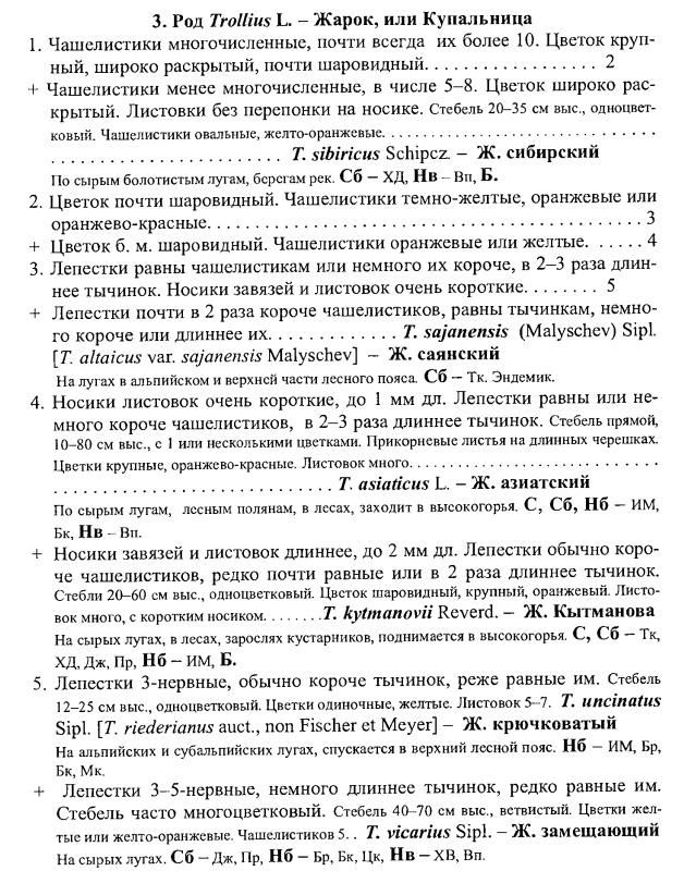 ВАЖНОЕ ПРИМЕЧАНИЕ: тут Trollius ircuticus Sipl. сведено в синонимы к Trollius kytmanovii Reverd., поэтому отдельно в ключе не упоминается.