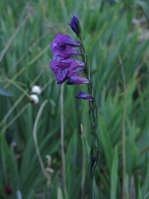 1. Развитых стеблевых листьев (с длинной пластинкой) 2; пластинка второго листа отходит от влагалища выше середины стебля; пластинка верхнего листа значительно короче нижнего прицветника соцветия; верхушка стебля выставляется из влагалища верхнего листа не более чем на 2 см; придаточные луковички-детки у основания материнской клубнелуковицы в числе 3-8. Соцветие 3-8-цветковое. Семена бескрылые, трёхгранные Gladiolus tenuis