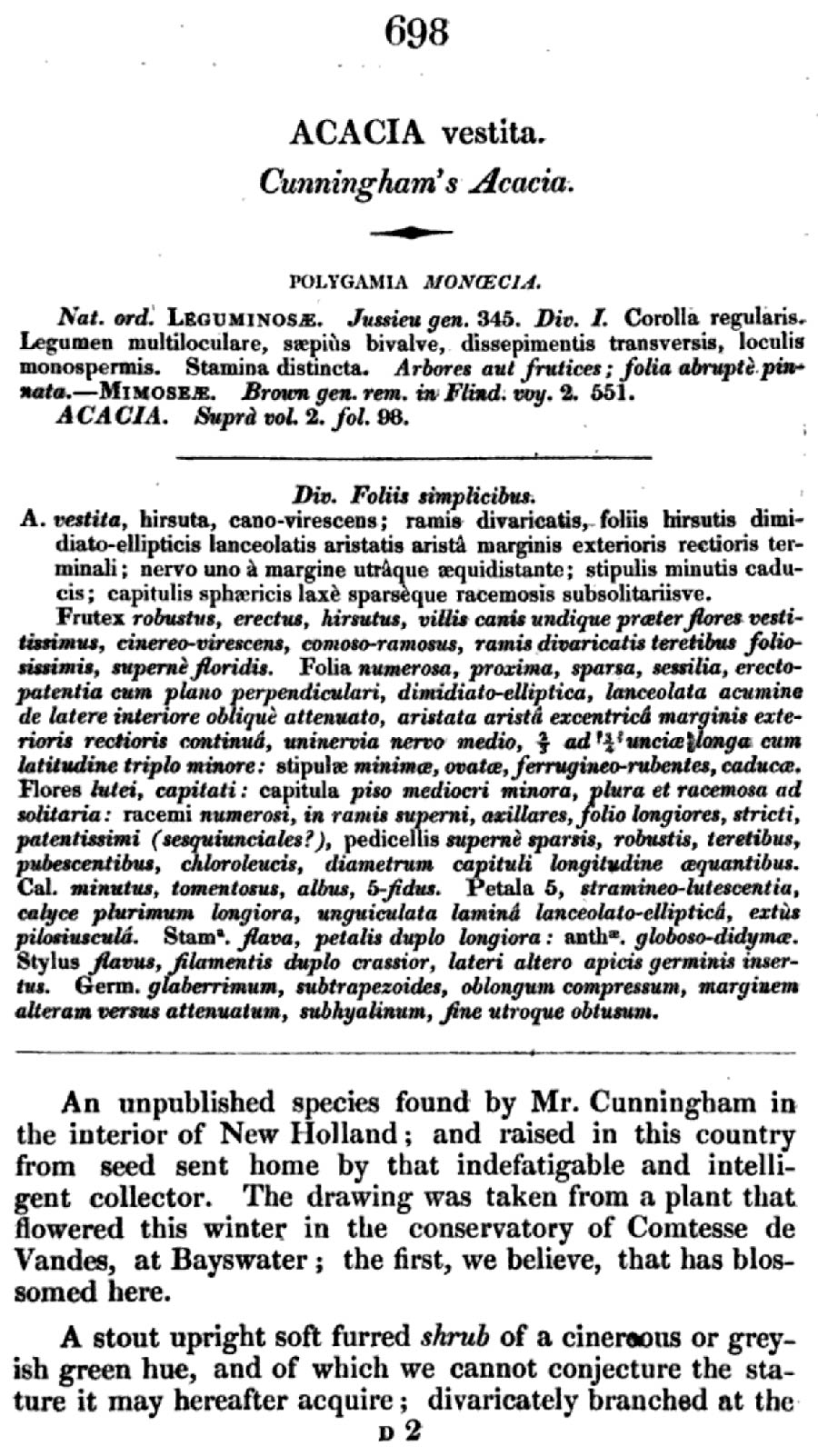 Протолог Acacia vestita Ker Gawl. и сопровождающая его иллюстрация (Botanical Register 9: t. 698. 1823):