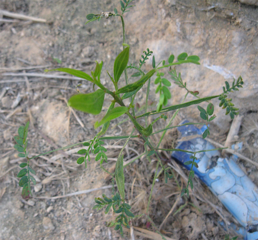 И ещё одно странное что-то. Проросток. Из широких лопухастых пластинок (тоже филлодии?) вырастает пара парноперистых листьев... К сожалению, сейчас этого подзаборного проростка уже нет, затоптали.
