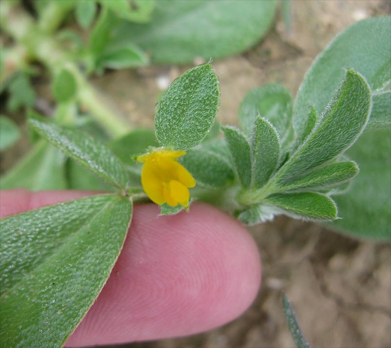 Очень симпатичная форма роста - все побеги молодых растений образуют лежащий на земле плоский ромб. На концах побегов - микроскопические жёлтые цветочки. И уже распускаются взрослые листья - сложные.