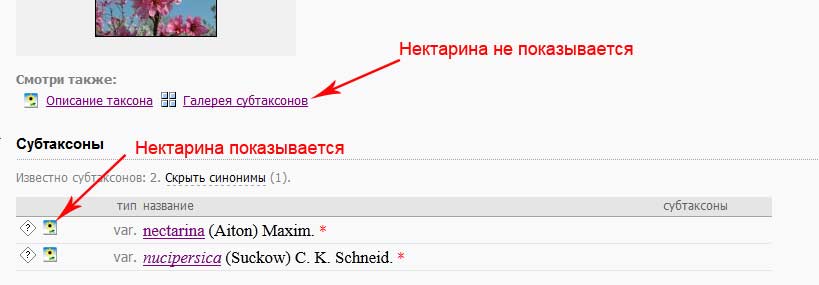 На странице Persica vulgaris http://www.plantarium.ru/page/taxonomy/taxon/30438.html есть возможность увидеть картинки субтаксонов, но при нажатии кнопки "галерея субтаксонов" не открывается ничего.
