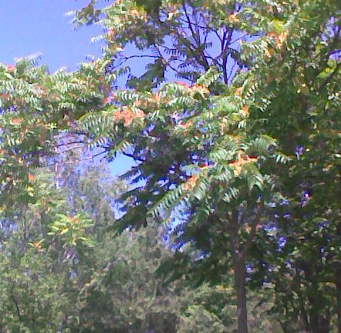 А, второе, очень похожие листья, но само дерево - пониже, с раскидистыми ветками, более темной корой и соцветиями в виде больших бордово-коричневых сложных метелок? |