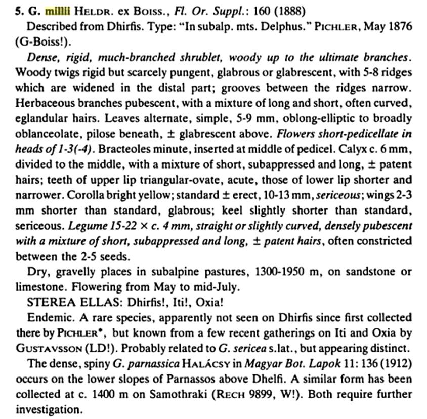 Genista millii Boiss. ex Heldr., Fl. Orient. (Suppl.): 160 (1888). Type: [Greece], in subalpinis montis Delphi Euboeae,