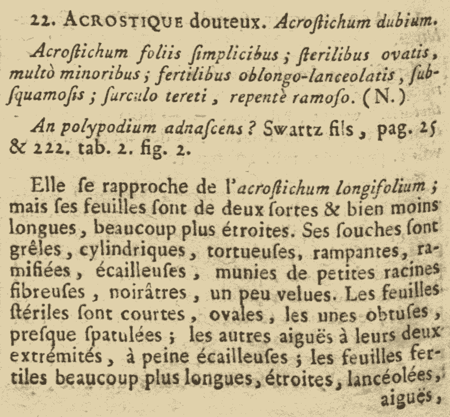 Типовой гербарный образец (голотип) Acrostichum dubium Poir.: https://science.mnhn.fr/institution/mnhn/collection/p/item/p00482683 Протолог Acrostichum dubium Poir. (Encyclopédie Méthodique. Botanique, Supplément 1(1): 120. 1810 [3 Sep 1810]):