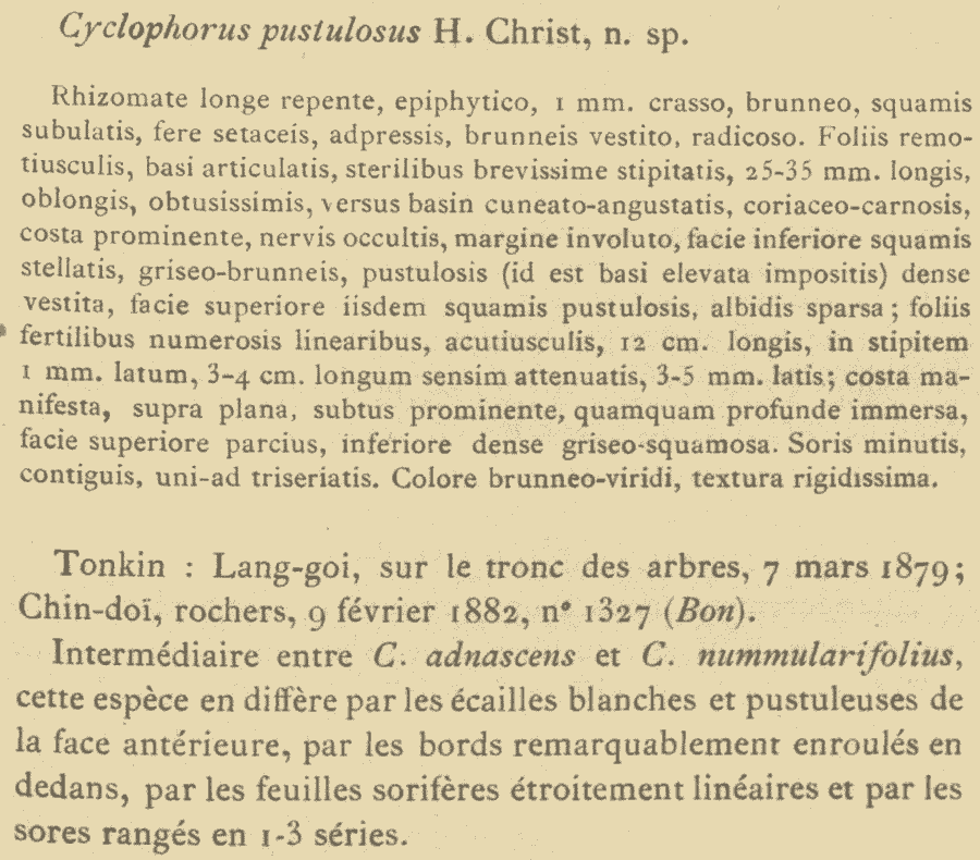 Протолог Cyclophorus pustulosus Christ (Notulae Systematicae. Herbier du Museum de Paris 1(6): 187. 1910):