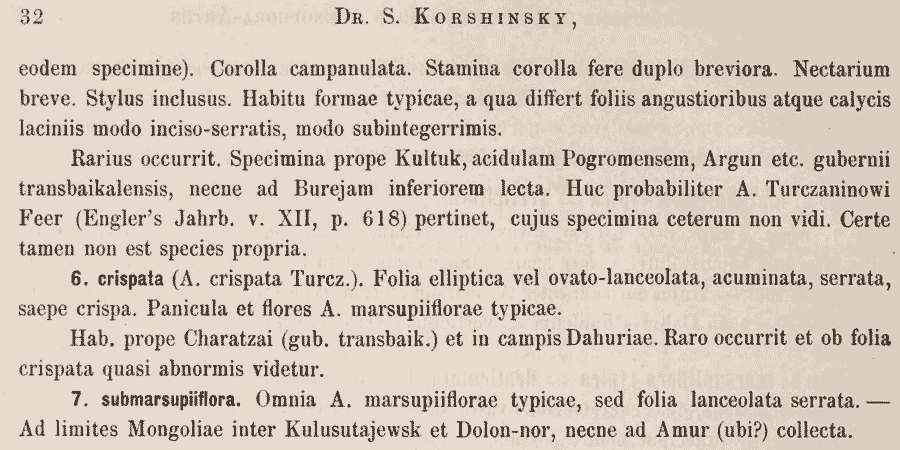 | Алексей Гребенюк | A. crispata (Turcz. ex Kitag.) Kitag. 1939, Rep. Inst. Sci. Res. Manch. 3. App. 1. [Lineam. Fl. Mansh.]: 415; Сенников, 1998, Новости сист. высш. раст. 31: 90. === A. marsupiiflora (Roem. et Schult.) Fisch. var. crispata Turcz. ex Kitag. 1935, Rep. First Sci. Exp. Manchoukuo, 4, 2: 108 (basionym.) |