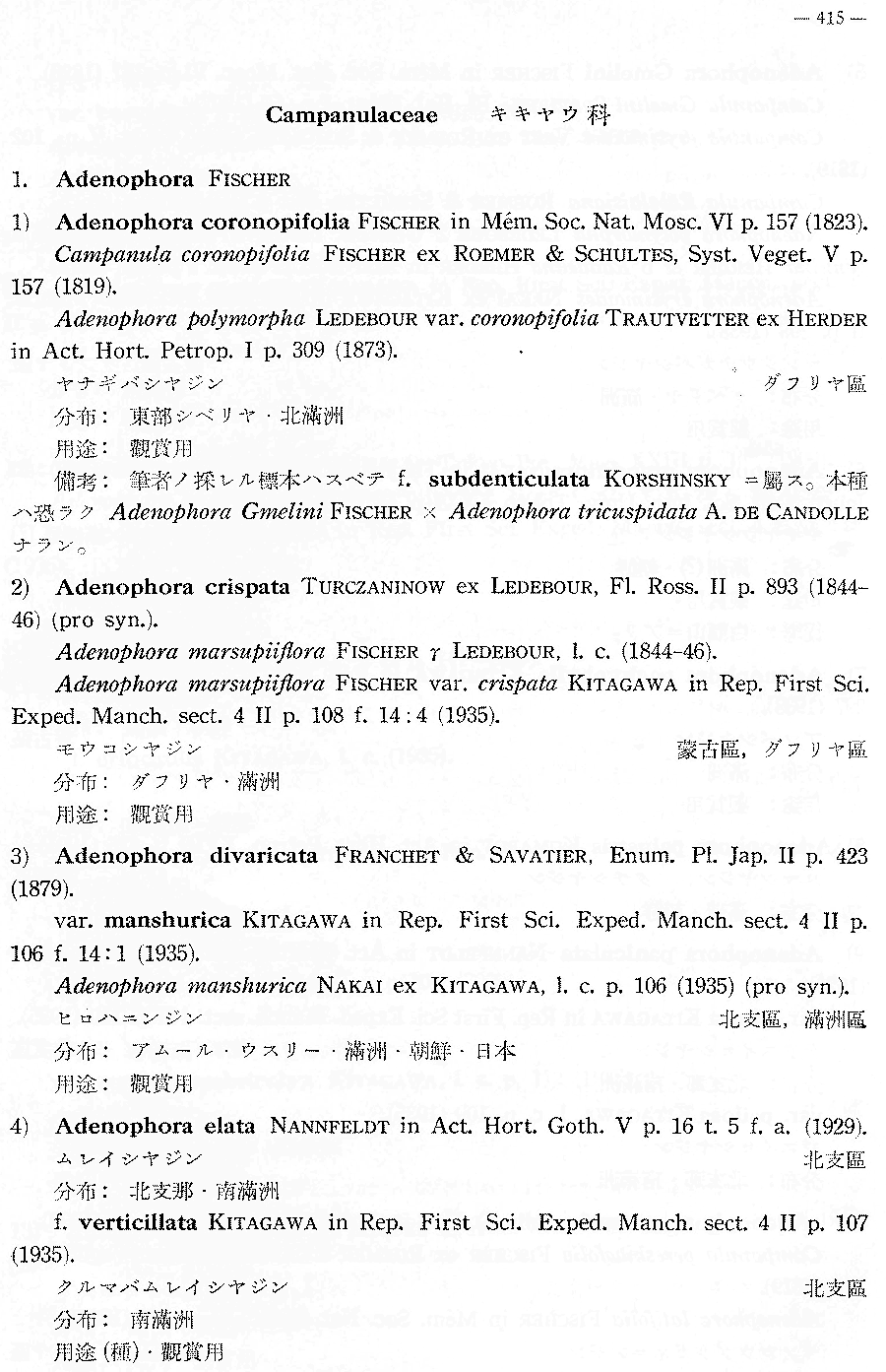 | Андрей Ковальчук | Обнародование комбинации Adenophora crispata (Turcz. ex Kitag.) Kitag. (Report of the Institute of Scientific Research, Manchoukuo 3 (App. 1: Lineamenta Florae Manshuricae): 415. 1939):