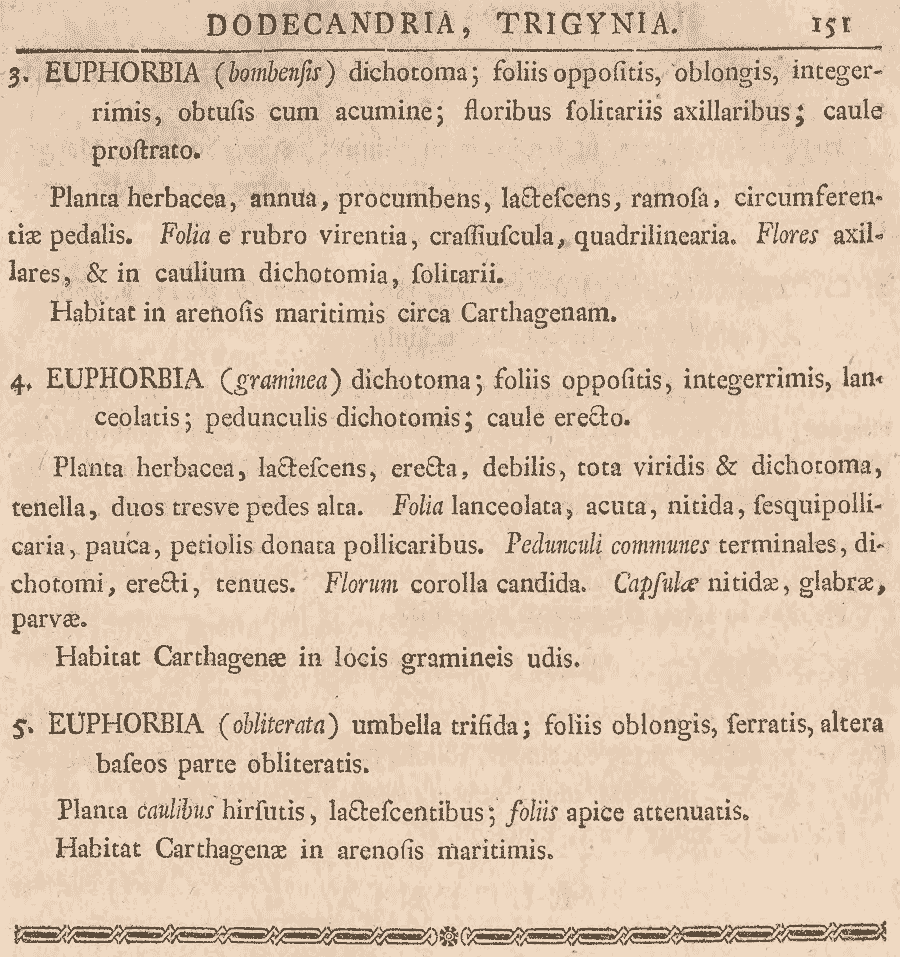 Что касается толкования видового эпитета, то в работе Н. Жакена 1767 г. (4-е сообщение данной темы) есть такая фраза: "Euphorbiam dixi gramineam, quia in pratis inter gramina crescit, quae debilem illam sustentet", которую, видимо, можно перевести примерно так: "Молочай был назван "graminea", потому что он растёт на лугах среди трав, которые поддерживают его слабые [побеги]". Т.е., он скорее не "злаковидный", а "травяной". |