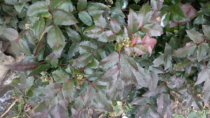 Добрый день! помогите, пожалуйста, определить название растения. Купил дачу, около домика растет такое "чудо". На зиму листья не скидывает, вечнозеленое. В теплое время года цветет желтыми соцветиями и образуются мелкие синие ягодки. Новые листья ярко зеленого цвета, как будто лаковые.