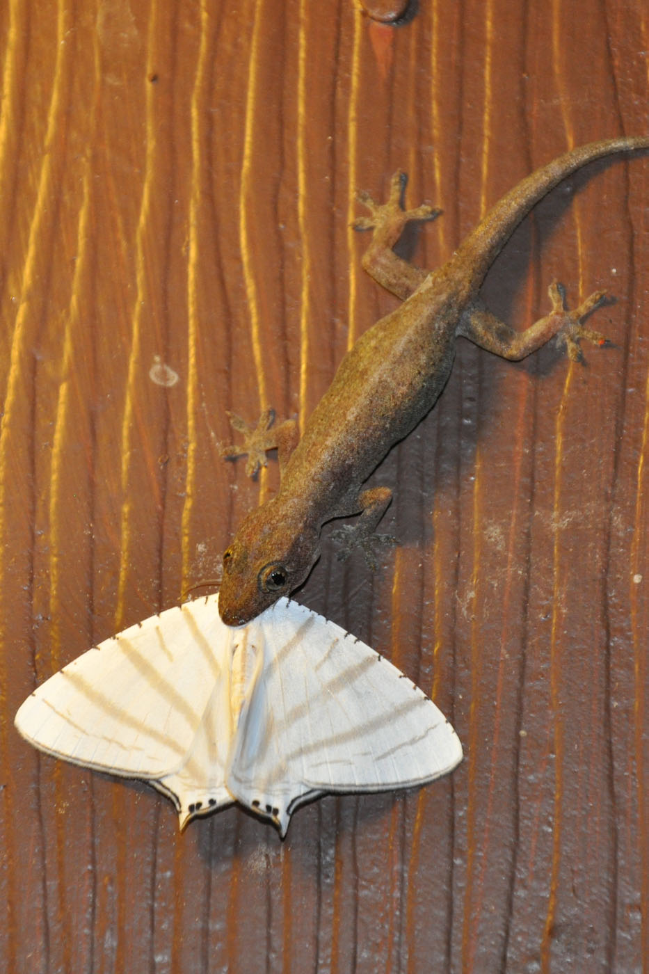 Не, я его обижать не собираюсь, но и кормить тоже - сам прокормится, полно всякого на свет уличной лампы прилетает. Кстати, померил ширину доски, на которой он сидел, - 4 см, она почти вся в кадре, исходя из чего, длина геккона - 5 см, ну может чуть больше, если вытянуть хвост, но не более 5.5.