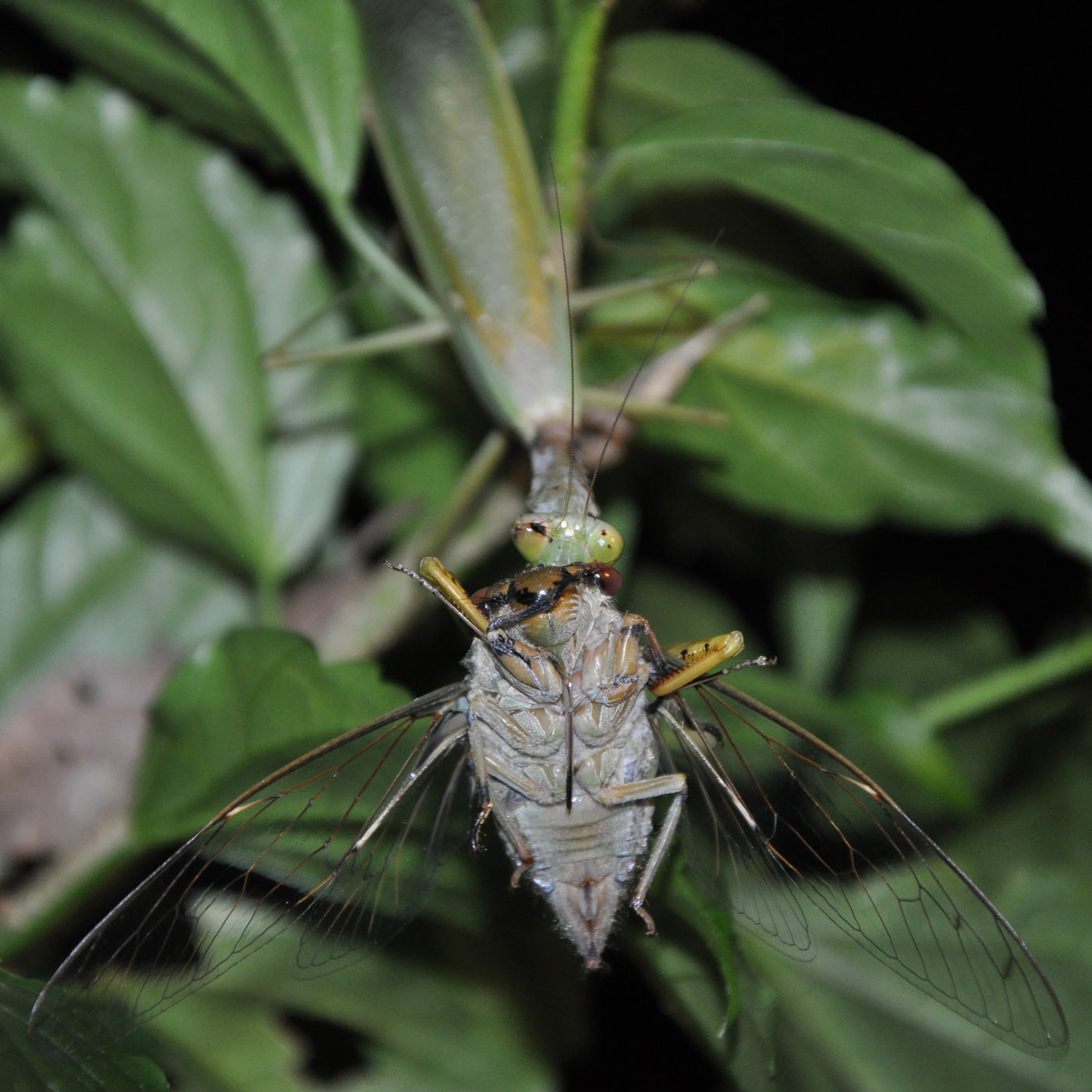 Как гекконов богомолы едят не видел, но вот поимку мегапомпонии размером с ладонь взрослого человека заснять удалось. Казалось, что еще немного - и она улетит вместе с богомолом.