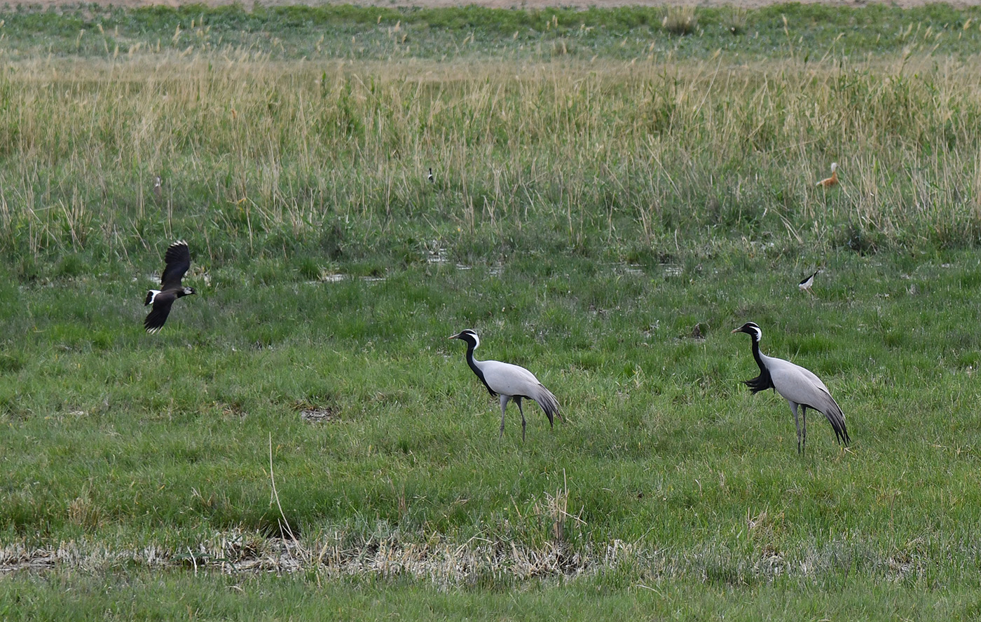 | Владимир Панкратов | Красавки и прогоняющий их чибис в Чу-Илийских горах. |