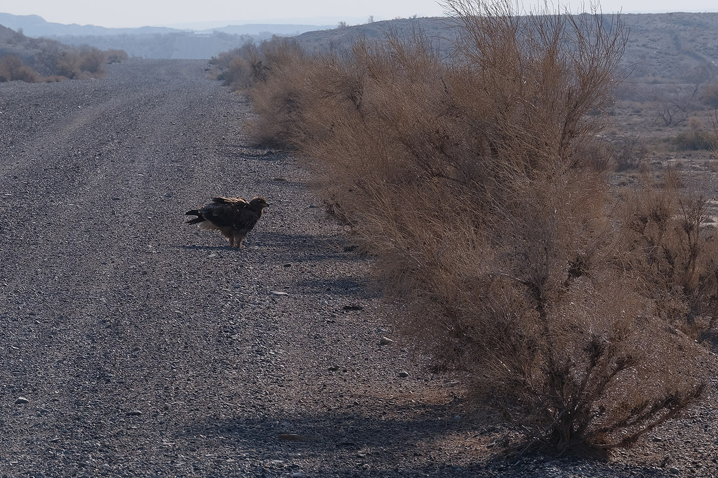 | Владимир Панкратов | Молодой беркут, едва продрав глаза, как курица, куда-то идёт по дороге в горах Богуты. Раннее утро — конвекции нет, песчанок нет, кофе нет, ящерицы спят, настроение, видимо, тоже отсутствует. |