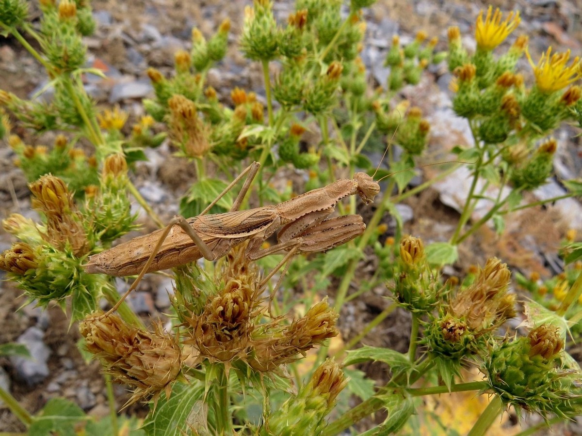 Самка богомола ( Bolivaria brachyptera) на кузинии Альберта ( Cousinia alberti).