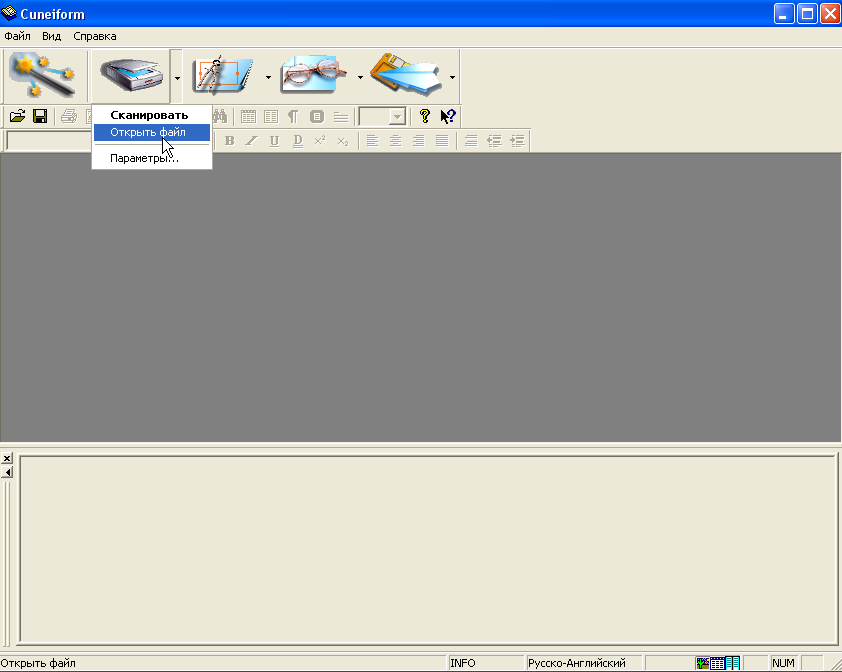 | Дмитрий Орешкин | Принцип работы прост - CuneiForm загружает изображения из файла или со сканера, распознаёт там буквы и представляет их как печатный текст. Этот текст можно скопировать в буфер обмена и куда-нибудь вставить (например, в форму на странице "Ботаническое описание") или сохранить как файл.