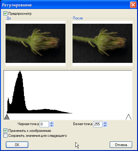 Но при увеличении яркости есть риск получить потерю детализации в светах. Вот, обратите внимание на гистограмму. Изначально она выглядела вполне прилично, но после осветления часть информации потерялась (пересвет отмечен оранжевой стрелкой). Причём пересвет на важной части - центральных цветках в соцветии