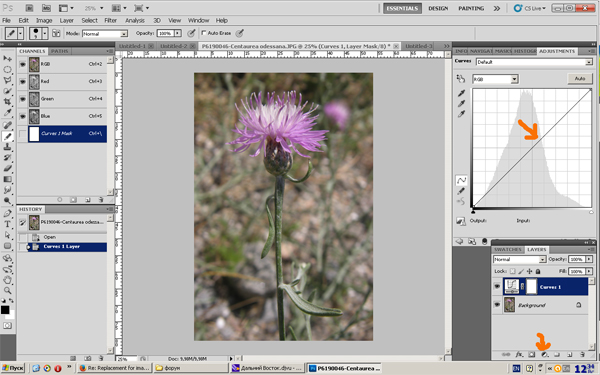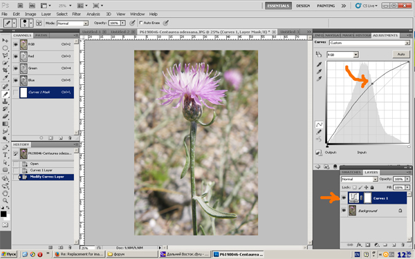 Щелкаем по прямой, проходящей через гистограмму (отмечена вверху). И начинаем её тянуть, смотрим при этом на результат. Чтобы улучшить контрат и при этом осветлить снимок, тянуть надо вверх. Чем круче кривая, тем лучше контраст. Крутые участки нужно как правило поместить на самую высокую часть гистограммы.