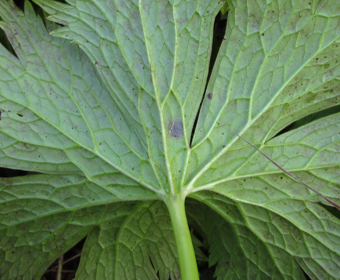 Стебель тут везде, кроме собственно соцветия, голый вообще. Листья сверху голые, снизу опушены немного только по жилкам. Биотоп, несмотря на высоту 1100 м - уже явно тяготеет к субальпийскому., вокруг лавиносходы, долинки ручьёв, криволесье и кедровый стланик по курумам и т.п., лес заканчивается; тополёвник-то этот - кусочек отдельный - как будто откуда принесён, необычно очень выглядит в таком окружении...