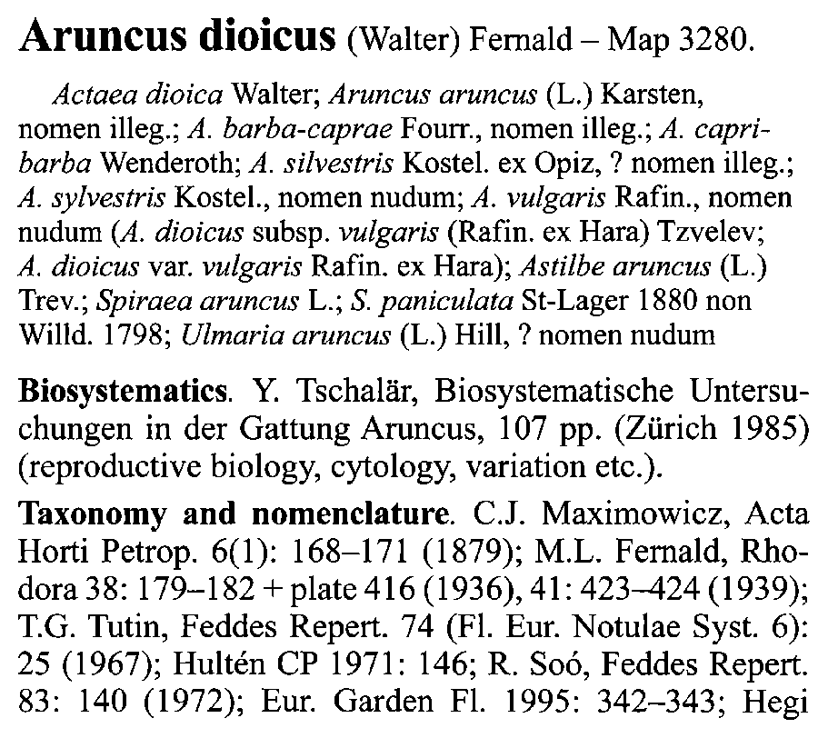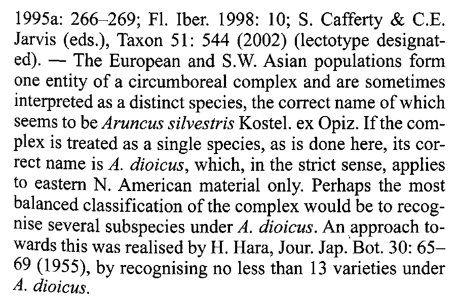 Название Aruncus vulgaris Raf. трактуется как nom. inval. и nom. nudum и в IPNI, и в Tropicos. Использовать его как основное просто несерьёзно. Так что у нас есть 2 варианта. Если мы продолжаем рассматривать европейские и дальневосточные растения в ранге самостоятельных видов, то названия Aruncus sylvester Kostel. ex Maxim., Spiraea aruncus L. и Spiraea paniculata St.-Lag. надо перенести в синонимы данного (европейского) таксона