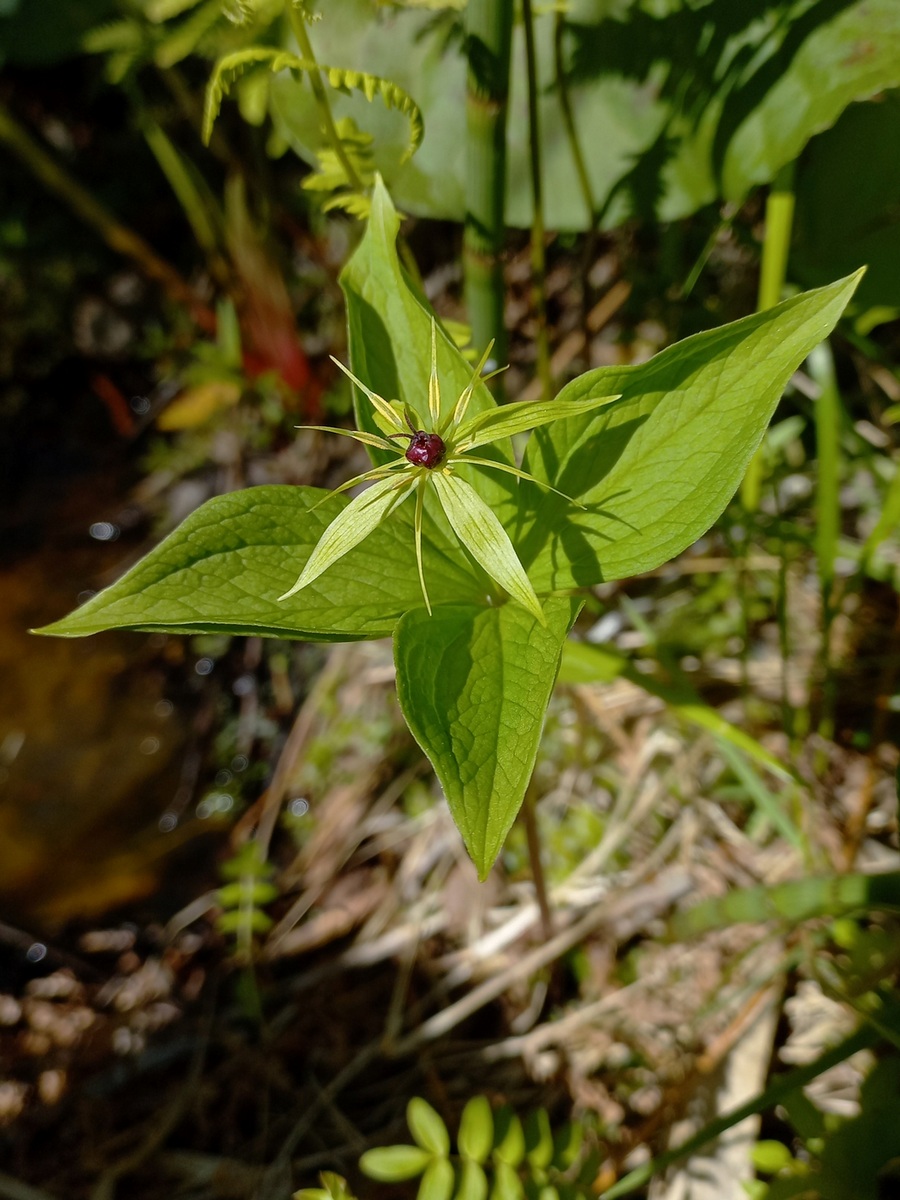 2. Наружные листочки околоцветника бледно-зелёные, с отношением ширины к длине 1/3.5-1/2,5; внутренние листочки околоцветника от основания резко книзу отклонены.... Paris verticillata Распространён от Байкала до Тихого Океана.