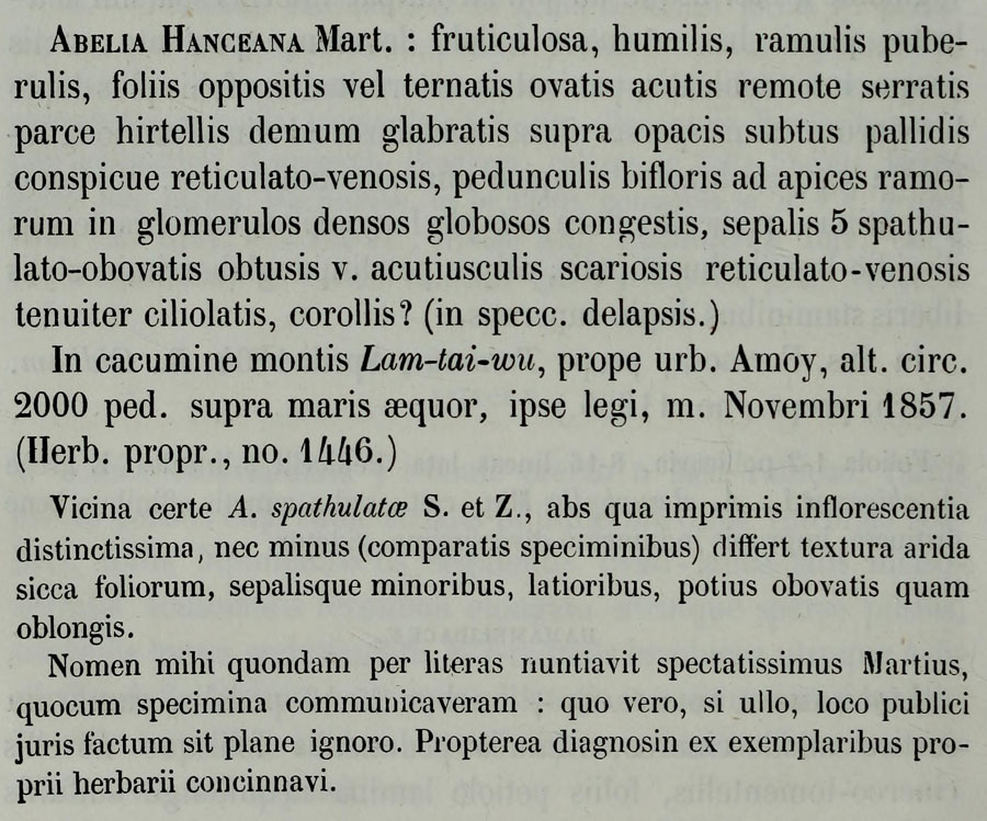 Протолог Abelia hanceana Mart. ex Hance (Annales des Sciences Naturelles; Botanique sér. 5, 5: 216. 1866):