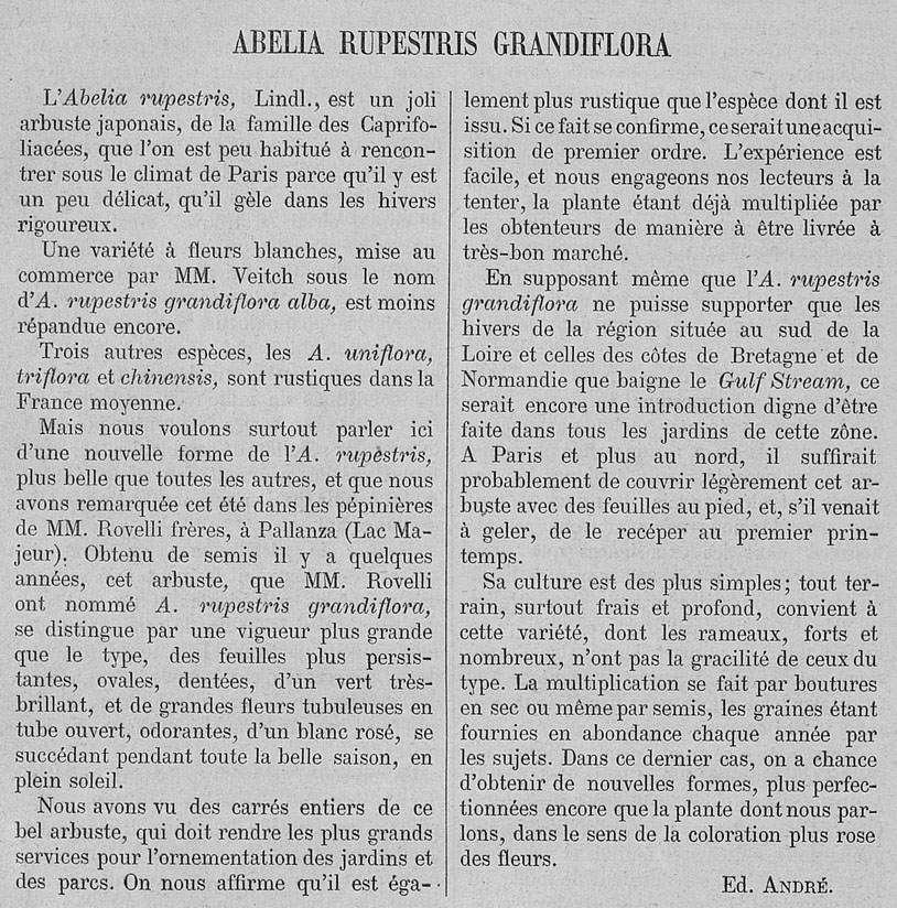 | Андрей Ковальчук | Протолог Abelia rupestris var. grandiflora Rovelli ex André (Revue Horticole; résumé de tout ce qui parait d'intéressant en jardinage 1886: 488. [1886]):