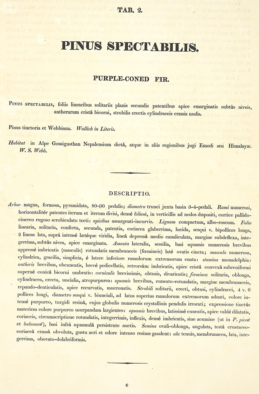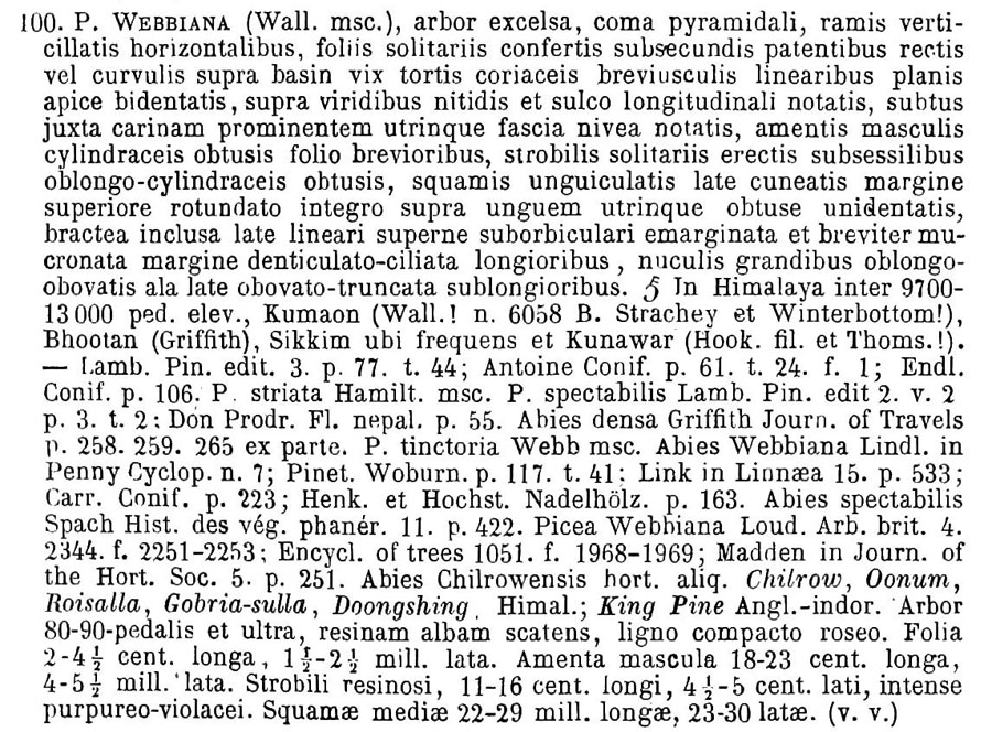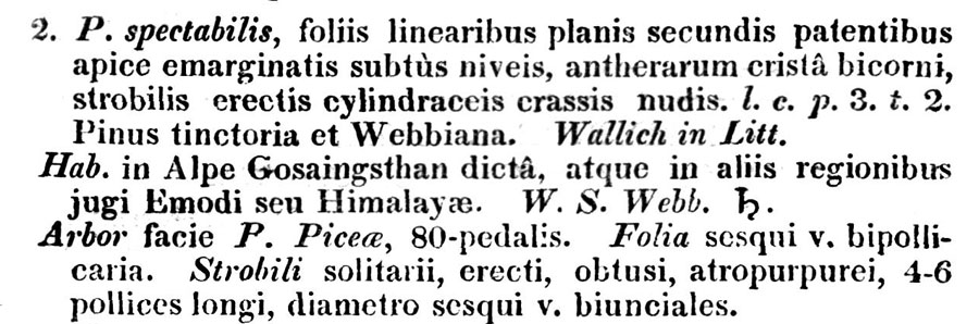 | Андрей Ковальчук | В некоторых источниках как место описания Pinus spectabilis (а также Pinus tinctoria Wall. ex D. Don) приводится работа 'Prodromus florae Nepalensis', вот соответствующий фрагмент оттуда (Prodromus florae Nepalensis: 55. 1825):