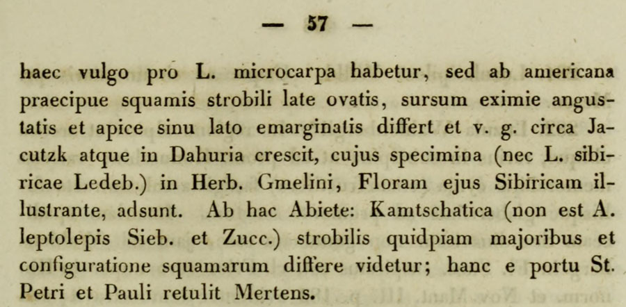| Андрей Ковальчук | Комбинации Larix russica (Endl.) Sabine ex Trautv. и Pinus larix γ. russica Endl., наверное, стоит отправить в синонимы к L. archangelica - Sabine прямо указывает, что растения были выращены из семян, полученных из Архангельска (такая же синонимизация принята в КФВЕ):
