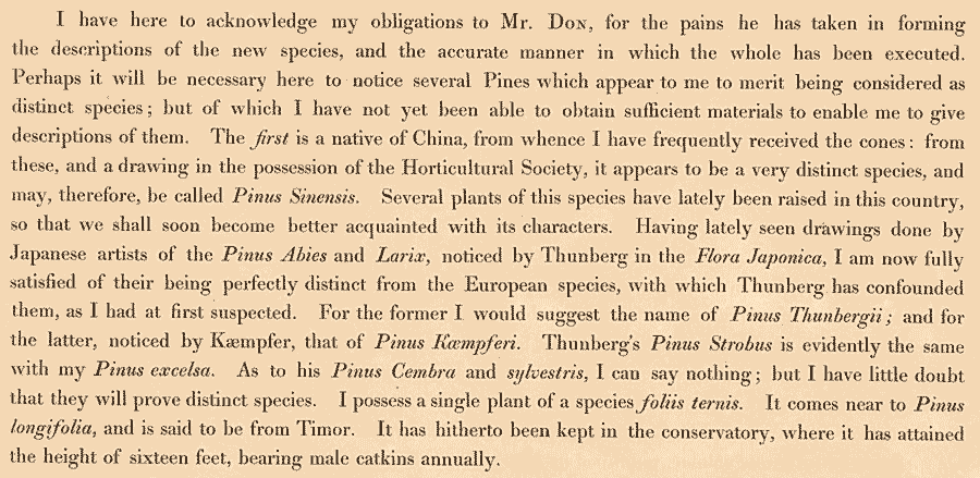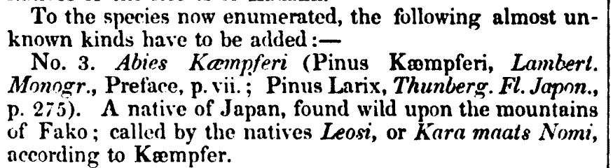 | Андрей Ковальчук | Номенклатура этого вида довольно запутанна (её разбор можно найти в этой работе: http://www.repository.naturalis.nl/document/551208). Из-за неоднозначностей, связанных с названием Pinus kaempferi Lamb., многие авторы прдпочитали использовать для этого вида эпитет " leptolepis". Ламберт при обнародовании своего названия не даёт описания нового вида, но ссылается на описания Кемпфера и иллюстрации (не уточняя при этом, какие именно). Описание Кемпфера из работы "Amoenitatum exoticarum politico-physico-medicarum" (fasciculi V: 883. 1712) также достаточно расплывчатое: