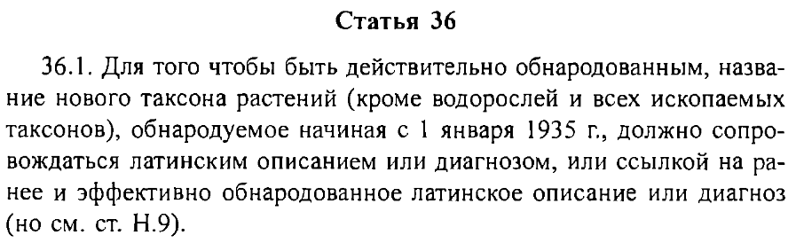 По крайней мере, с одной оговоркой: в период, когда была опубликована эта статья, диагноз или описание любого названия таксона растений необходимо было составлять на латинском языке. | | Юрий Постников |