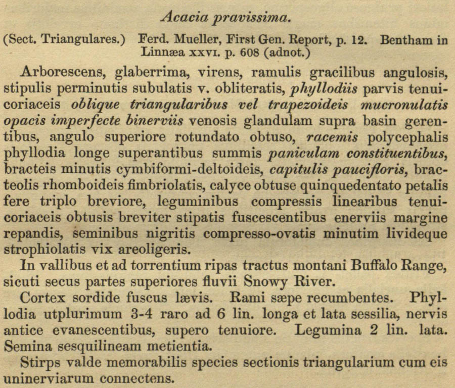Название Acacia pravissima вначале было опубликовано Мюллером без описания. Валидизировал его Бентам (Linnaea 26: 608. 1854):