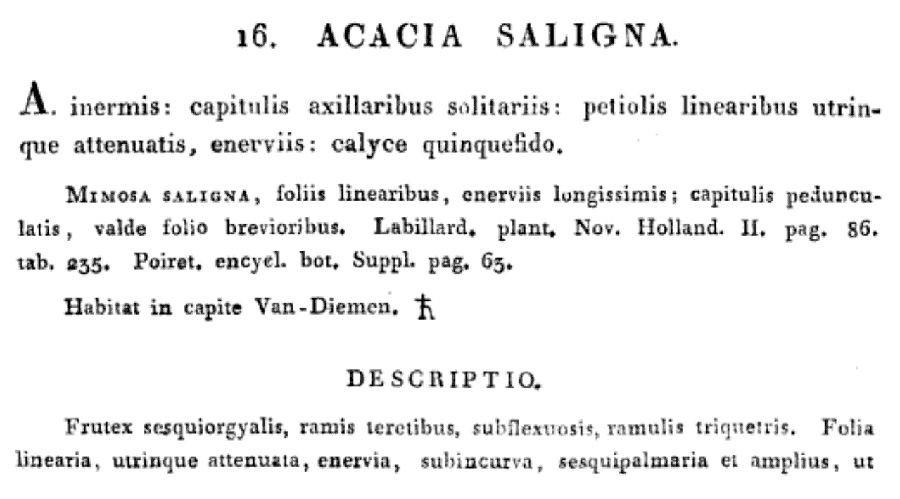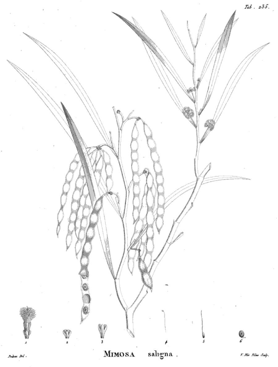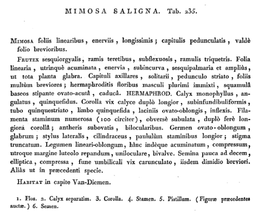 Протолог Mimosa saligna Labill. и сопровождающий первоописание рисунок (Novae Hollandiae Plantarum Specimen 2: 86, t. 235. 1806):