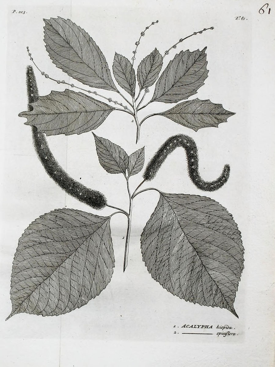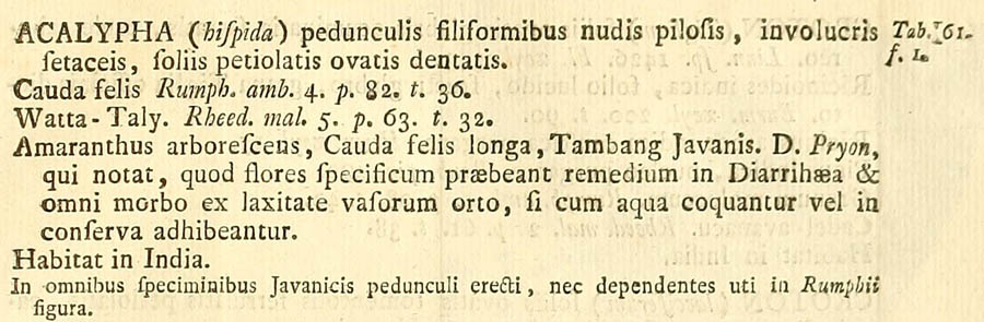 | Андрей Ковальчук | Протолог Acalypha hispida Burm. f. и иллюстрация, сопровождающая первоописание и являющаяся типом вида (растение под номером 1 в нижней части рисунка) (Flora Indica: cui accedit series zoophytorum indicorum, nec non Prodromus Florae Capensis 303, t. 61. 1768 [1 Mar-6 Apr 1768]):