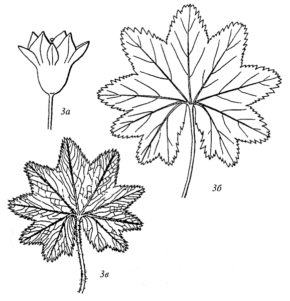 L. emend. Fröhner): а) цветок; б), в) прикорневые листья.