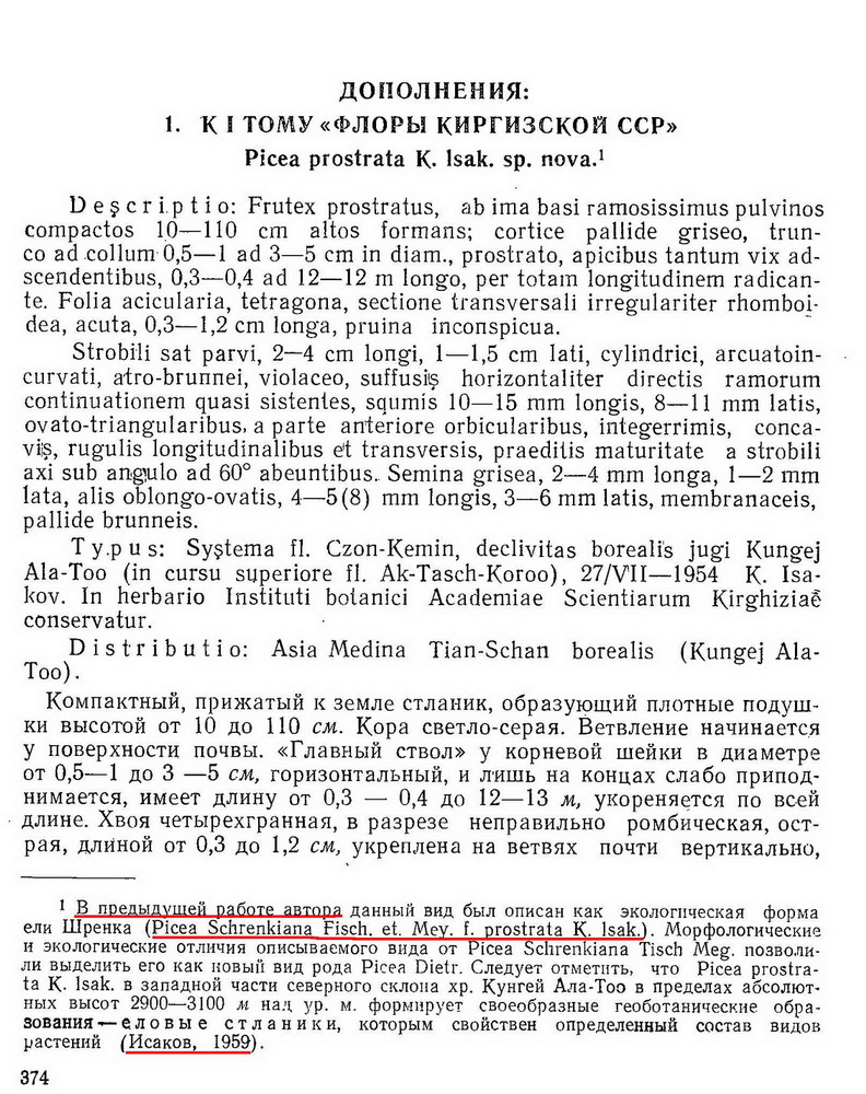 | Наталья Гамова | В КК Казахской ССР (1981) есть вид Picea schrenkiana Fisch. et Mey. f. prostrata K. Isakov - стланиковая форма ели Шренка