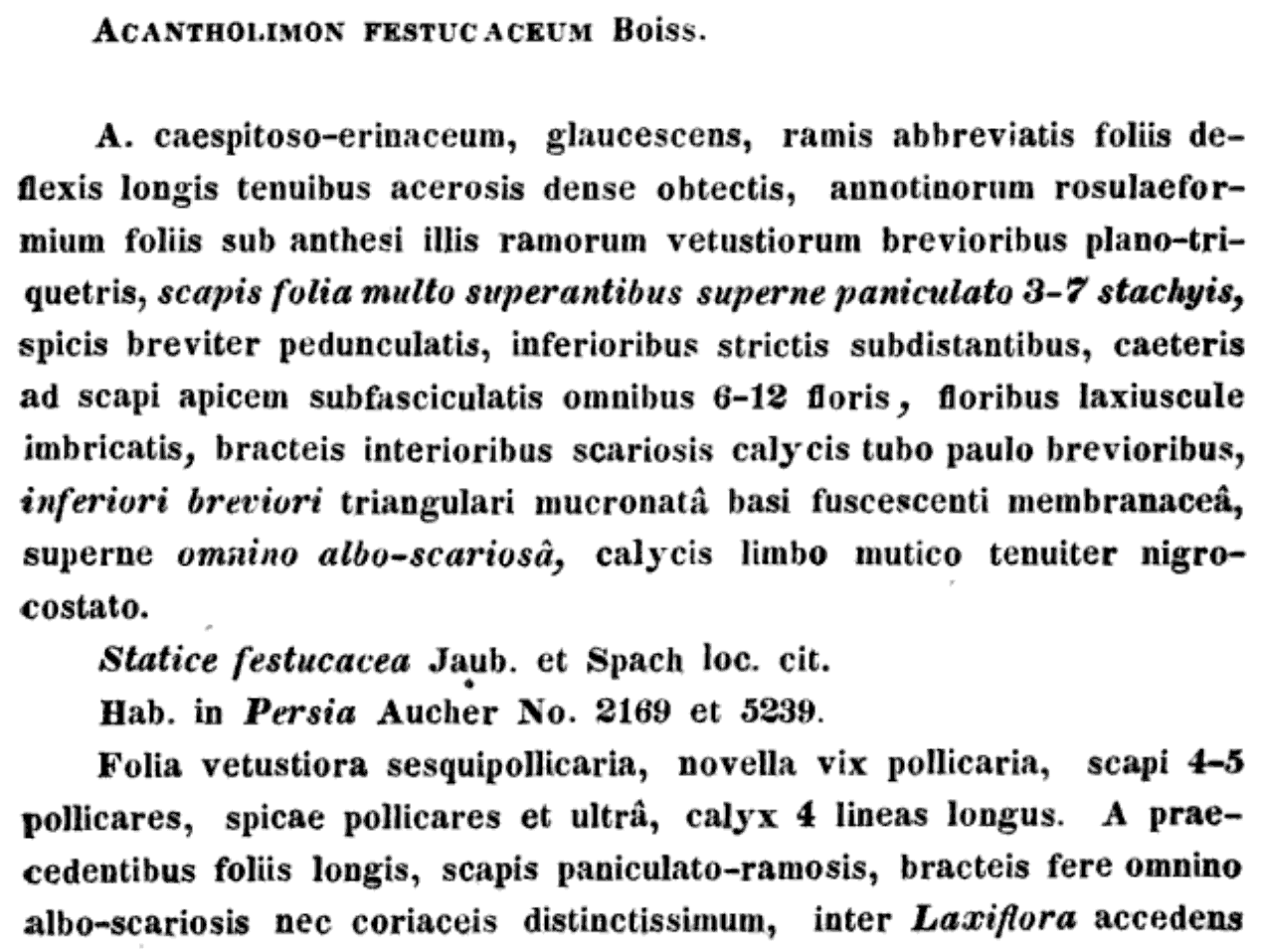 | Андрей Ковальчук | Обнародование комбинации Acantholimon festucaceum (Jaub. et Spach) Boiss. (Diagnoses Plantarum Orientalium novarum ser. 1, 7: 76(-77). 1846 [Jul-Oct 1846]):