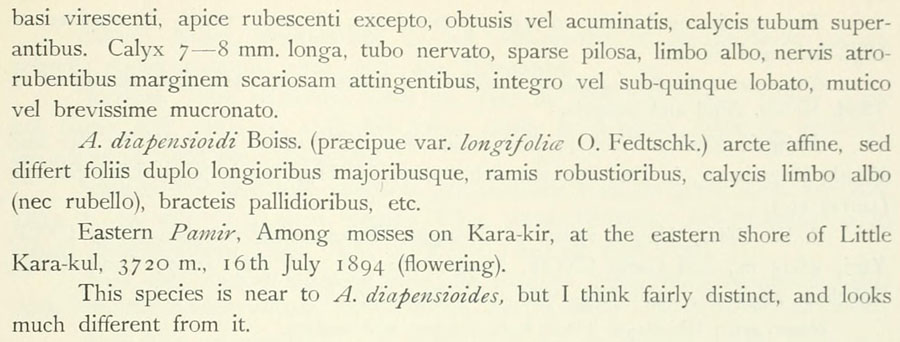 | Андрей Ковальчук | Протолог Acantholimon diapensioides var. longifolia O. Fedtsch. (Acta Horti Petropolitani 21: 407. 1903):