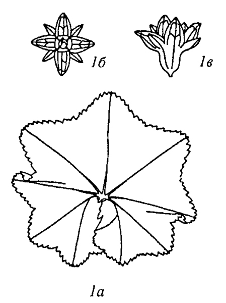 Рисунок Н.Н. Сычак из 10-го тома Флоры Восточной Европы, стр. 518: а), прикорневой лист; б), в) цветки.