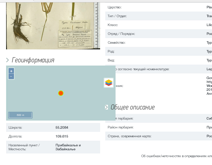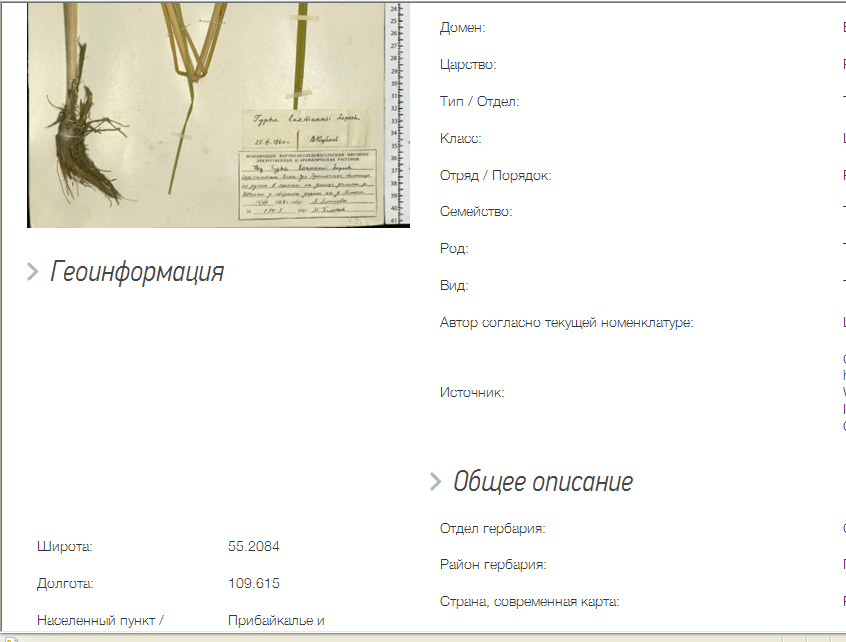 Поиск работает, если в окно ввести просто название вида, но эта фраза про "БИОМАТЕРИАЛ - ГЕРБАРНЫЙ ОБРАЗЕЦ" как-то немного в ступор вводит. Возникает вопрос: а что ещё можно посмотреть? |