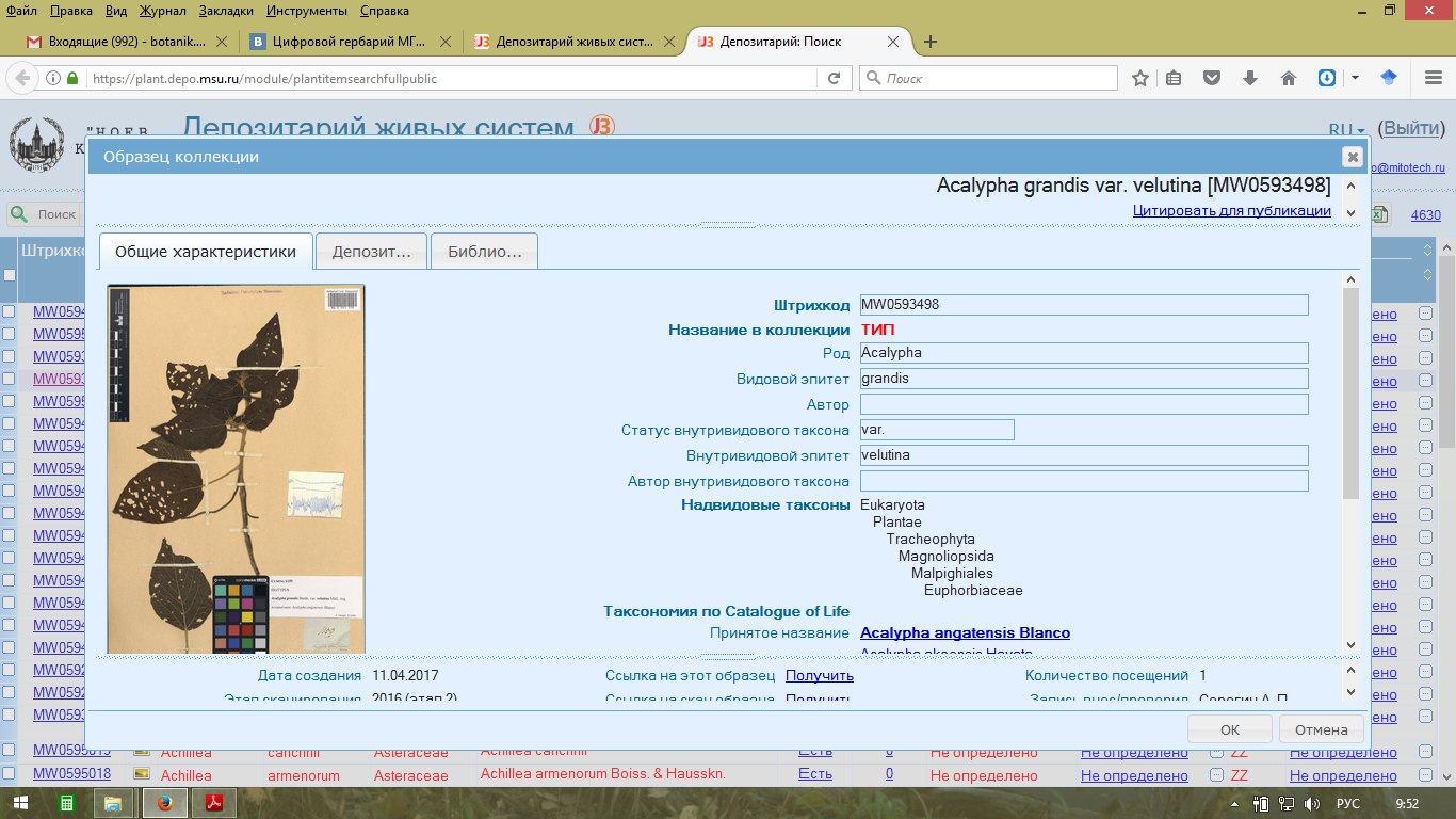 | Наталья Гамова | В Цифровом гербарии МГУ наконец-то появились типы. Это 4630 образцов почти 3000 таксонов. При поиске такие записи выделяются красным цветом. Изображения выполнены в стандарте 600 dpi, вес каждого - около 50 мегабайт.